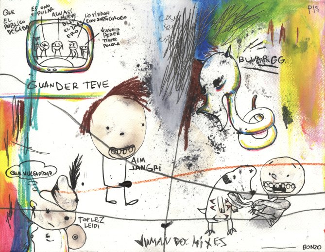 Acrílico, grafito, lápiz graso, jugo de naranja, alcohol, tinta china y lápices de colores sobre papel libre de ácido 300 grs. Año 2006.